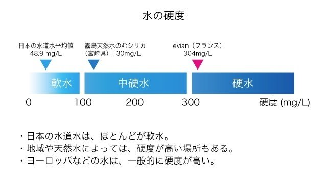 お水の中には「カルシウムイオン」と「マグネシウムイオン」が含まれていて、これらが水1L中にどのくらい溶けているのか表した数値を「硬度」と言います。